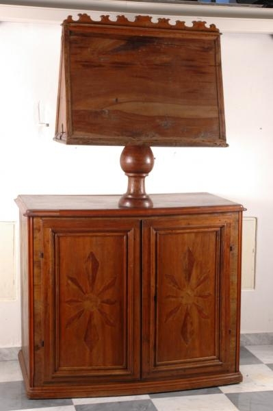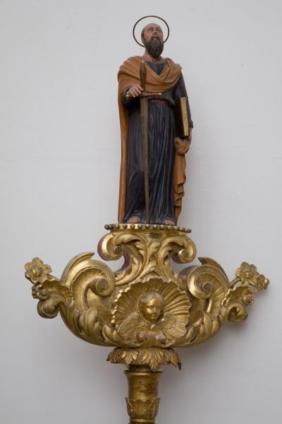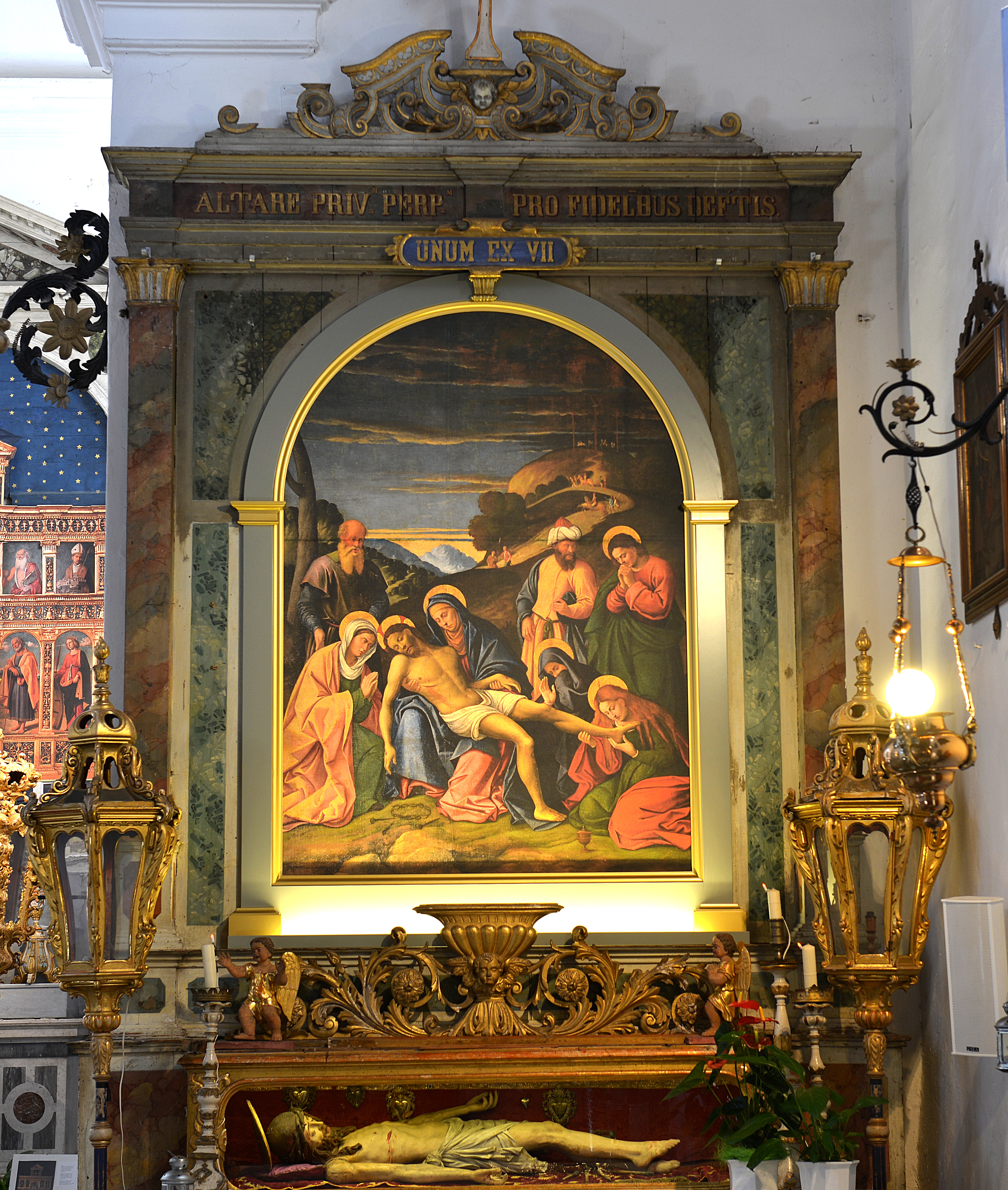 The right side of the church nave is rounded off by the altar of Lamentation (Pieta), where the original altar piece is missing as well. The next altar in the direction towards the church door is dedicated to St. Andrew, the patron saint of the fishermen’s confraternity. The last altar on the right is dedicated to the Franciscan saint St. Didacus. Until the Second World War a reliquiary with the bones of Blessed Monaldus da Capodistria was placed on this altar. The fourteen Stations of the Cross on the walls were painted by Lorenzo Pedrini in 1746. Directly over the church entrance is the organ loft with the organ of the Venetian master Francesco Merlini of 1805. It is a fully preserved Venetian organ with the original disposition. In the church one can also see the procession signs with the statues of patron saints of various confraternities and gold-plated lanterns used in festive processions.