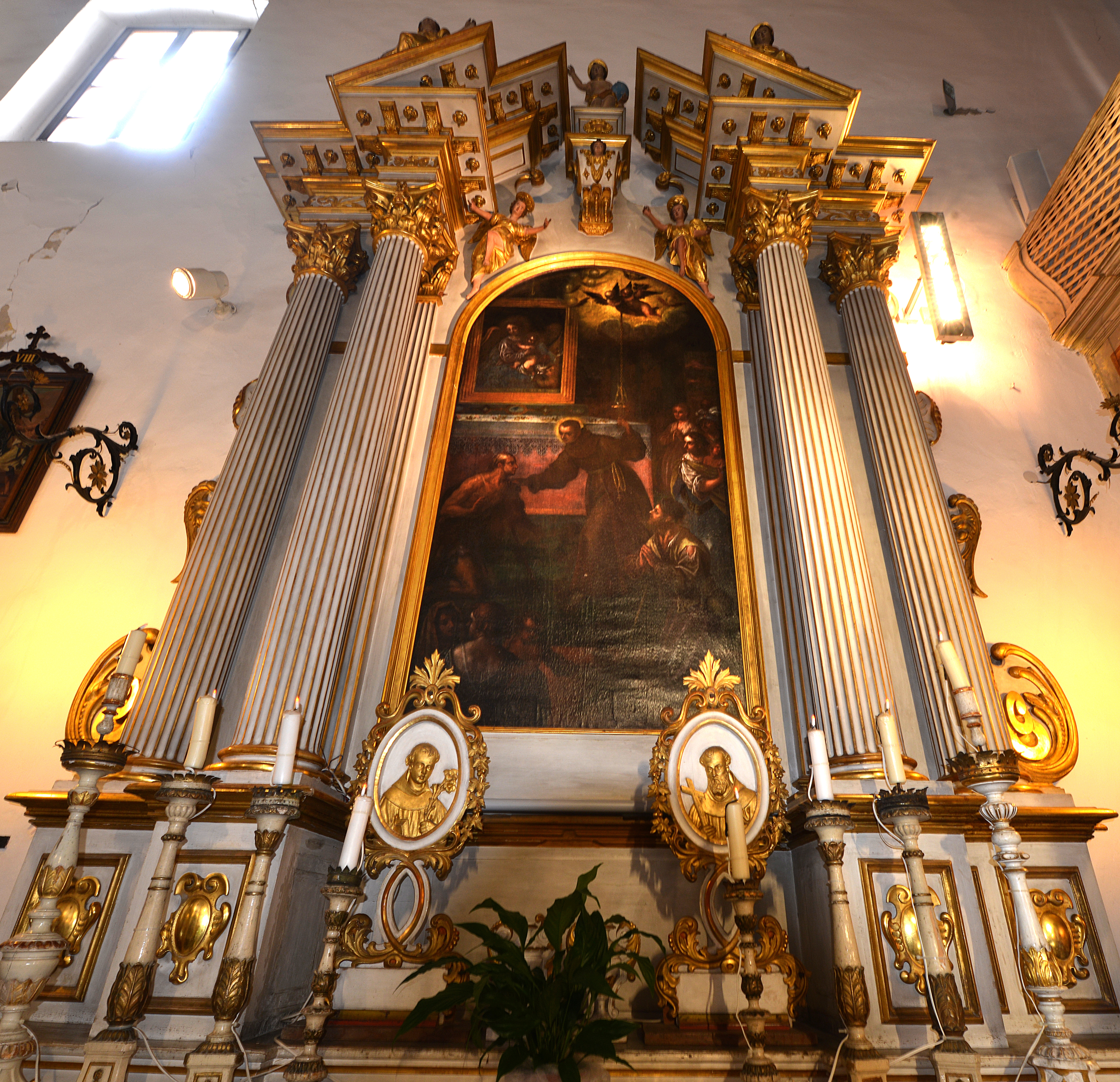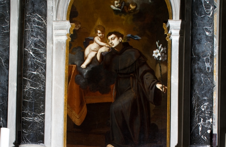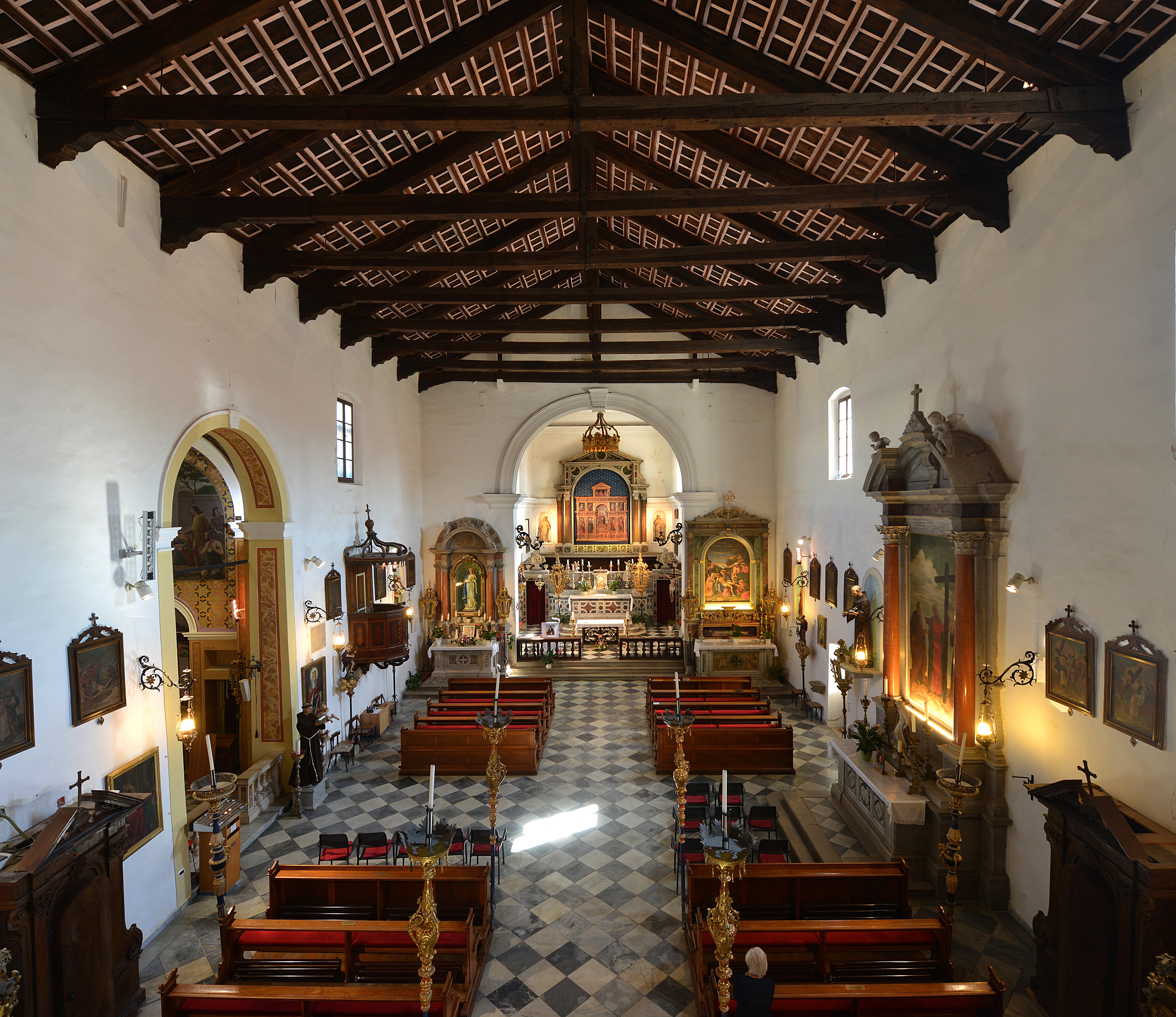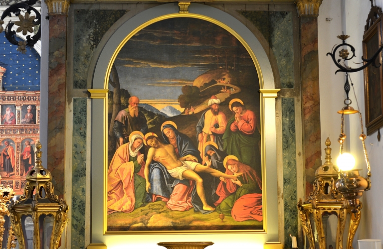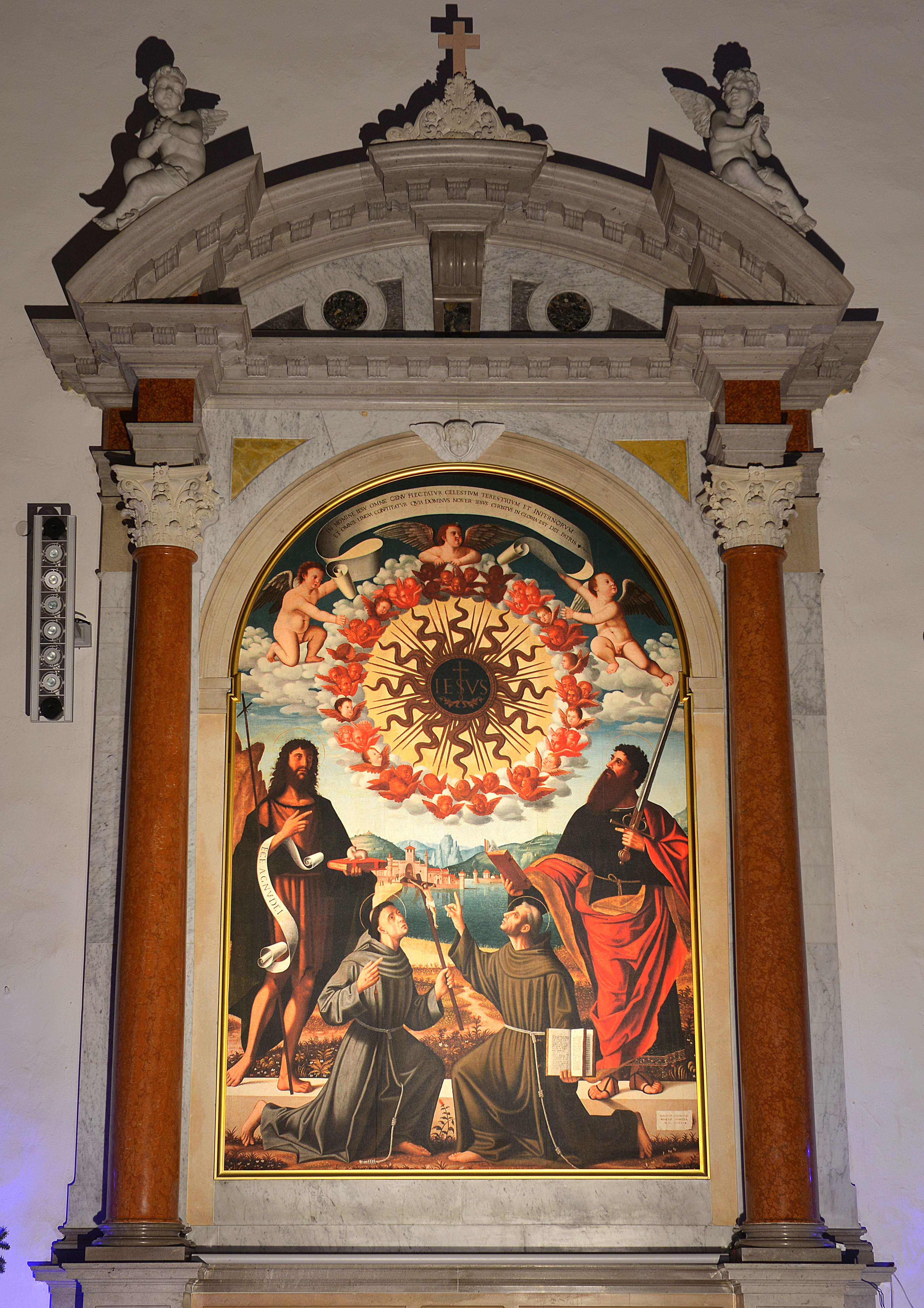 Oltre all’altare maggiore la chiesa ha ancora sei altari laterali. Partendo dall’entrata verso sinistra, incontriamo come primo l’altare del nome di Cristo. La pala originaria è tra le opere d’arte che ancora si trovano in Italia. Nella cappella laterale c’è l’altare di S. Antonio di Padova con la pala d’altare, opera di Pietro Bellotti. Sulle pareti e nelle nicchie della cappella sono riprodotte immagini della vita di San Antonio, sotto la cupola i quattro evangelisti. Chiude la parte sinistra della navata l’altare della Madonna di Lourdes.