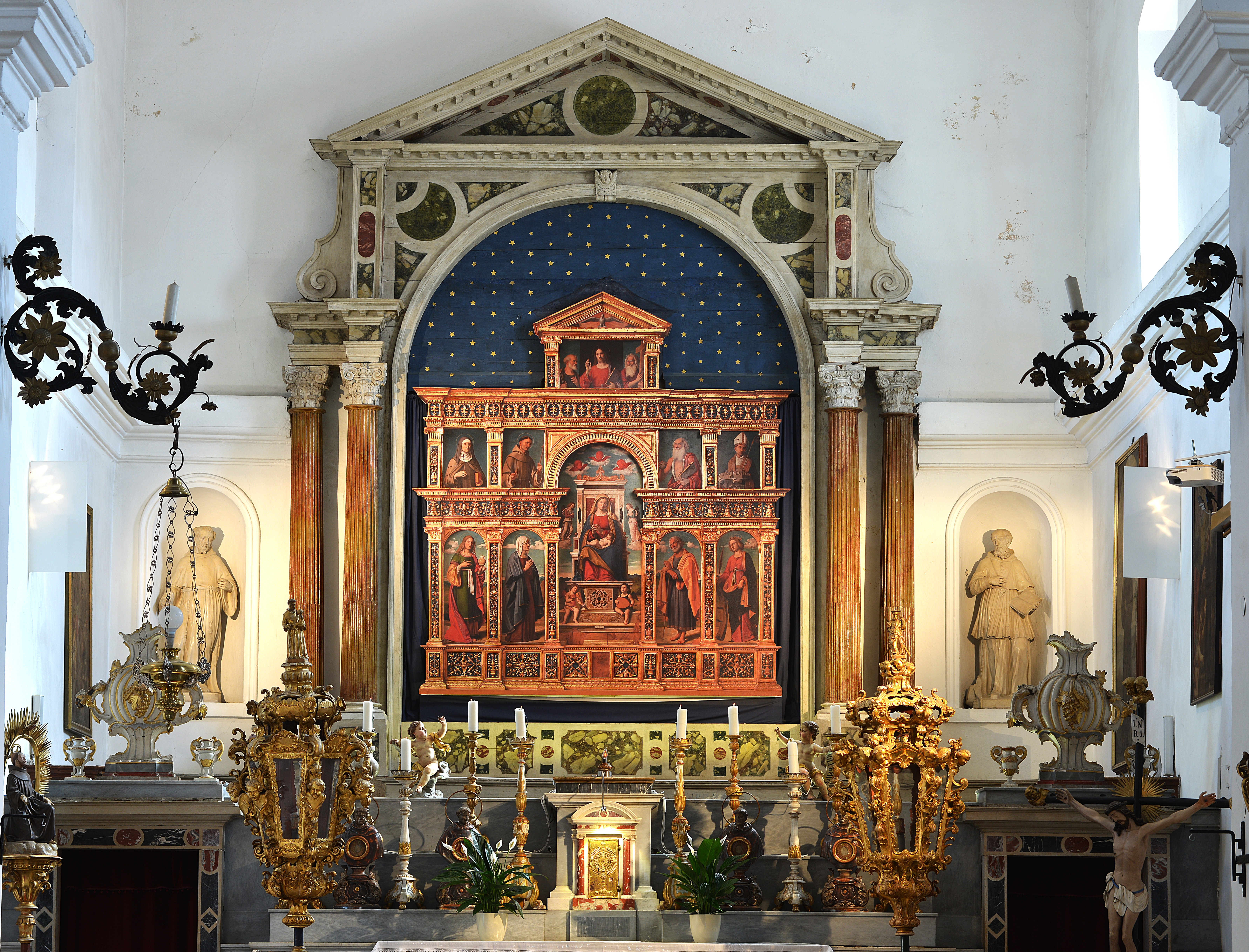 L’altare maggiore è privo del polittico originario di Cima da Conegliano, la Madonna col bambino e santi, che si trova in Italia. Sul polittico, tra i santi raffigurati, c’e anche Sant’Anna, patrona della chiesa e madre della Vergine Maria. La festa di Sant’Anna si celebra il 26 luglio assieme alla festa di suo marito San Gioacchino. Sulla parete a sinistra dell‘altare maggiore c‘è la bellissima pala della Madonna e Sante interceditrici nella malattia: Santa Maddalena, Santa Caterina d’Alessandria, Santa Apollonia e Santa Lucia.